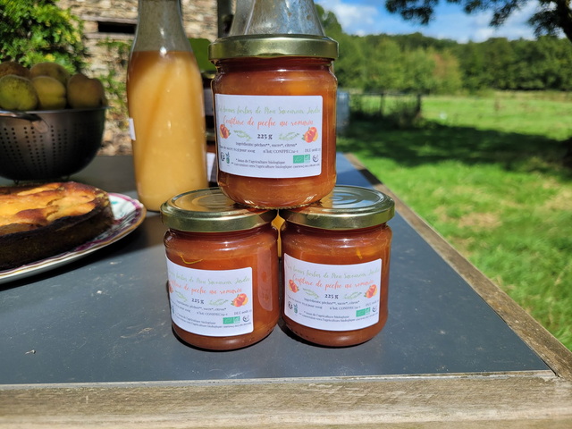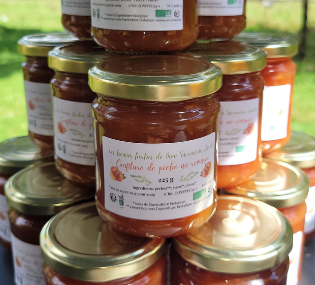 Ingrédients: pêches **, sucre*, jus de citron*, romarin**