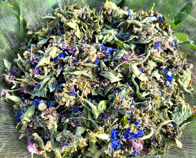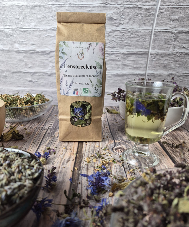 Tulsi, verveine citronnée, menthe bergamote, aubépine, bleuet, achillée millefeuille, mélisse, lavande, sauge sclarée, pour un moment de détente.