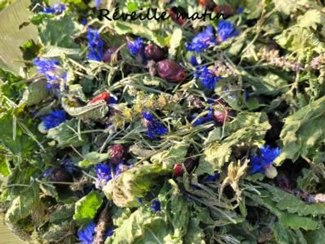 Tisane composée d'ortie, romarin, basilic sacré, verveine d'argentine ou menthe verte, cynorhodon et bleuet pour démarrer la journée de bon pied